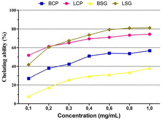 Figure 2. The chelating capacity of the CEE of the bark and leaves of Caesalpinia pyramidalis Tul. e Sapium glandulosum (L.) Morong. BCP = bark of C. pyramidalis; LCP = leaves of C. pyramidalis; BSG = bark of S. glandulosum; LSG = leaves of S. glandulosum.