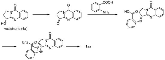 This strategy was applied in the first total synthesis of luotonins A and B. Ma et al. also isolated vasicinone (4a), a pyrroloquinazoline alkaloid from Peganum nigellastrum Bunge, along with luotonin A and some other alkaloids, which allowed them to propose a possible biosynthetic route to luotonin A from vasicinone (4a) and anthranilic acid as shown in Scheme 1 [3].