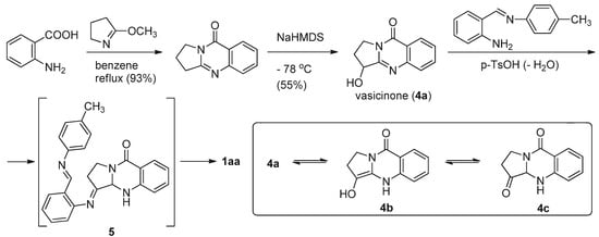 A few years later, the same authors used the reaction between 4a and N-(2-aminobenzylidene)-p-toluidine in the presence of p-TsOH to prepare luotonin A [19] (Scheme 2). The starting vasicinone can be tautomerized to the corresponding keto tautomer 4c, which can be readily condensed with the toluidine derivative of 2-aminobenzaldehyde to form a Schiff’s base 5 which then undergoes cyclization via an enamine, followed by aromatization to afford luotonin A.