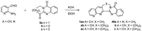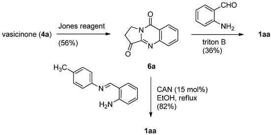Since its discovery in 1882 the Friedländer condensation of 2-aminobenzaldehyde and ketones has long been one of the most efficient synthetic methods for preparing quinolines [20,21,22]. Kelly et al. applied the Friedländer condensation to pyrrolo[2,1-b]quinazoline-3,9-dione (6a), prepared by Jones oxidation of vasicinone, to yield luotonin A in 36% yield (Scheme 3) [23,24]. Recently, this low yield was increased to 66% by employing cerium(IV) ammonium nitrate (CAN) as a catalyst [25]. In addition, replacement of 2-aminobenzaldehyde by N-(2-aminobenzylidene)-p-toluidine improved the yield up to 82%.