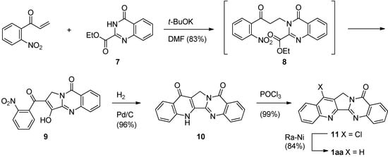 In addition, the quinoline ring can be formed via 4(1H)-quinolinone [26]. Michael addition of ethyl 4-oxo-3,4-dihydroquinazoline-2-carboxylate (7) to 1-(2-nitrophenyl)propenone gave an 83% yield of compound 8, which undergoes a spontaneous intramolecular Claisen condensation to afford enolizable 1,3-diketone 9 (Scheme 4). Catalytic hydrogenation of 9 in the presence of Pd/C afforded the 4(1H)-quinolinone derivative 10, which was then chlorinated using POCl3 to yield 14-chloroluotonin A (11). Hydrogenolysis of 11 with activated Ra-Ni gave luotonin A. 14-Cloroluotonin A can be used as a useful starting material for introducing various substituents at the C14 position of luotonin A.