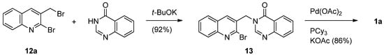 Harayama et al. reported the first synthesis of luotonin A via C-ring formation, in which Heck biaryl coupling reaction was employed to form a C-C bond between C2 of a 4(3H)-quinazolinone and C2 of a quinoline using an electrophilic Pd reagent in DMF. N-Alkylation of 4(3H)-quinazolinone with 2-bromoquinolin-3-ylmethyl bromide yielded 3-[(2-bromoquinolin-3-yl)methyl]-4(3H)-quinazolinone (12a) which was then subjected to Heck coupling condition [27,28] (Scheme 5).