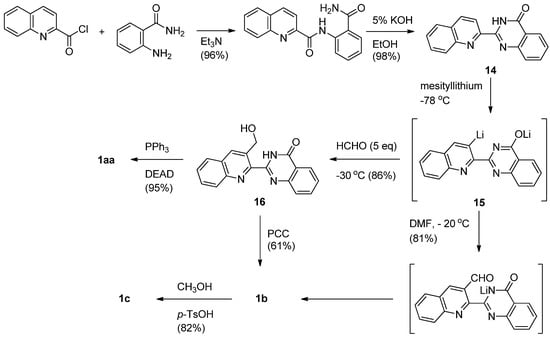 On the other hand, Mhaske and Argade employed a regioselective quinazolininone-directed ortho-lithiation on an adjacent quinoline moiety as a key step to make luotonins A, B and E [29] (Scheme 6). Acylation of anthranilamide with quinaldic acid chloride afforded the corresponding diamide, which was readily cyclized by 5% KOH to yield 2-quinolino-4(3H)-quinazolinone (14) in quantitative yield. Lithiation of 14 afforded the di-lithiated species 15 which can be readily converted to luotonin A in two steps via 3-hydroxymethyl derivative 16 employing a Mitsunobu condensation. Reaction of 15 with DMF spontaneously afforded luotonin B, which could also be prepared by PCC oxidation of 16. Luotonin B was converted to luotonin E by treatment with methanol in the presence of p-TsOH. The procedure has the advantage of generating a library of quinazolinone alkaloids by reacting di-lithiated species with a variety of electrophiles.