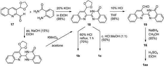 Intermediate 16 was also be prepared by NaBH4 reduction of the corresponding carbaldehyde 19, prepared by hydrolysis of the prerequisite acetal 18 by Chavan and Sivappa [30] (Scheme 7). The key acetal 18 was prepared either directly from quinoline-2-carbaldehyde 17 and anthranilamide in the presence of 20% KOH in EtOH or by a two-step synthesis employing 15% NaOH in EtOH followed by oxidation with KMnO4. It is noteworthy that this procedure afford three luotonins from a common intermediate 18. Hydrolysis of the acetal moiety in 18 and reduction of the resulting aldehyde afforded the corresponding alcohol 16 which could be cyclized either by a Mitsunobu reaction or, more conveniently, by treatment with sulfuric acid in EtOH to yield luotonin A. Alternatively, refluxing of 18 in aqueous acid resulted in luotonin B (1b) while refluxing in a 1:1 mixture of conc. HCl-CH3OH afforded luotonin E (1c).