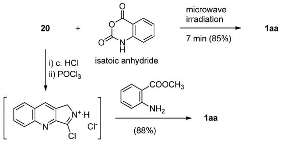 In fact, the first total synthesis of luotonin A was achieved by Wang and Ganesan, in which 2,3-dihydro-[1H]-pyrrolo[3,4-b]quinolin-3-one (20) was coupled with 2-sulfinylaminobenzoyl chloride, generated from anthranilic acid and thionyl chloride, in the presence of LiN(TMS)2[32] while direct condensation of the lactam and 2-sulfinylaminobenzoyl chloride by Kametani’s quinazoline formation procedure yielded only a 6% yield of luotonin A (Scheme 8). In addition, reaction of lactam 20 with 2-nitrobenzoyl chloride followed by reduction of the nitro group resulted in luotonin A in 38% overall yield [33]. Microwave assisted synthesis of the quinazoline ring from a lactam and isatoic anhydride was also applied to the synthesis of luotonin A (Scheme 9). Thus, a mixture of lactam 20 and isatoic anhydride was subjected to microwave irradiation at 450 watts for 7 minutes to yield luotonin A in 85% yield [34]. On the other hand, direct reaction of 20 and methyl anthranilate in the presence of POCl3 yielded luotonin A [35,36], while the use of the HCl salt of 20 improved the yield significantly [37]. Such reaction conditions have been further simplified in a one-pot reaction of lactam 20, ethyl anthranilate, and SOCl2 in refluxing benzene to afford luotonin A in 75% yield [38].
