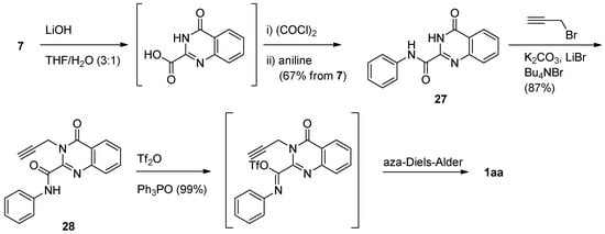 A similar cascade reaction was applied to 27 in the presence of bis(triphenyl)oxodiphosphonium triflate (prepared in situ) to yield luotonin A via an intramolecular aza Diels-Alder reaction [40] (Scheme 11). Hydrolysis of ethyl 4-oxo-3,4-dihydroquinazoline-2-carboxylate (7), followed by a two-step amide formation, yielded the corresponding N-phenyl-4(3H)-quinazoline-2-carboxamide (27). N-phenyl-3-propargyl-4(3H)-quinazoline-2-carboxamide (28) was treated with triphenylphosphine oxide in the presence of (CF3SO2)2O to yield luotonin A in 58% overall yield.