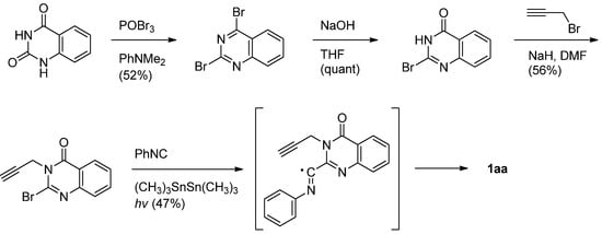 Curran and his coworkers employed a similar intramolecular radical coupling of 2-bromo-3-propargyl-4(3H)-quinazolinone and phenyl isonitrile in the presence of hexamethylditin and light. [41] (Scheme 12).