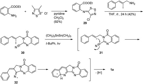 Bowman et al. have reported yet another versatile synthesis employing a cascade radical cyclization of a cyano-alkene compound to produce luotonin A [42,43] (Scheme 13). The prerequisite radical precursor 30 was prepared in 42% yield by a reaction of ethyl 2-[(4-chloro-5H-1,2,3-dithiazol-5-yliden)amino]-benzene-1-carboxylate (29) and (Z)-2-iodo-3-phenylprop-2-en-1-amine while a direct N-alkylation of 2-cyano-4(3H)-quinazolinone with (Z)-2-iodo-3-phenylprop-2-enyl bromide yielded 30 in 16% yield. Treatment of above vinyl iodide 30 with hexamethylditin in the presence of light yielded the corresponding radical 31 which undergoes 5-exo cyclization onto the nitrile group at C2 of the 4(3H)-quinazolinone nucleus to produce the iminyl radical intermediate 32, which subsequently undergoes a homolytic aromatic substitution via 6-endo (or 5-exo cyclization followed by neophyl rearrangement) with the loss of a hydrogen atom to yield luotonin A.