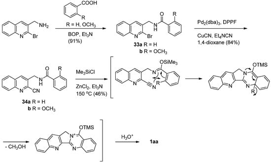 Toyota et al. reported an additional efficient synthesis of luotonin A employing an intramolecular hetero Diels-alder reaction of an aryl iminoether with an aryl nitrile [44,45] (Scheme 14). Palladium-catalyzed coupling reaction of 2-bromoquinoline derivatives 33 with CuCN afforded the corresponding 2-cyanoquinoline derivatives 34. Heating 34b with TMSCl and Et3N at 150 °C in toluene in a stainless sealed tube in the presence of ZnCl2, afforded luotonin A in 46% yield, while 34a did not yield luotonin A. The methoxy group in 34b apparently not only increases the HOMO energy to accelerate the reaction, but also readily acts as a good leaving group after cyclization to restore the aromaticity of the benzene ring (ring E).