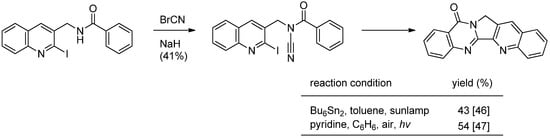 Courillon and coworkers reported a cascade radical cyclization of N-acylcyanamides as an alternative procedure for the 4(3H)-quinazolinone nucleus, which led to the total synthesis of luotonin A [46,47] (Scheme 15). Cyanation of N-[(2-iodoquinol-3-yl)methyl]benzamide with cyanogen bromide afforded the corresponding N-CN compound which was subjected to radical cyclization to yield luotonin A. The yields were highly dependent on the reaction conditions.