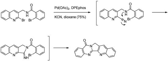 This method has been modified by Ju et al. who employed sequential cyanation, N-addition, followed by N-arylation of N-[(2-bromoquinolin-3-yl)methyl]-2-bromobenzamide leading to construction of C- and D-rings in one step in a two-stage, one-pot manner [48] (Scheme 16). The reaction was initiated by the Pd-catalyzed cyanation at C2 of the quinoline moiety, followed by intermolecular nucleophilic N-addition of an amide to a nitrile to generate an imidamide intermediate, which undergoes additional Pd-catalyzed intramolecular N-arylation with an aryl halide to allow the one-step construction of the pyrroloquinazolinone skeleton.