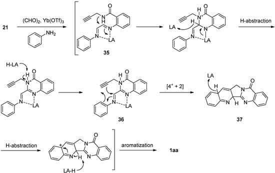 The cascade cyclization method was recently modified by Tseng et al. The reaction of 21 with glyoxal in the presence of Yb(OTf)3yielded 1,4-diazadiene 35 which underwent cyclization, followed by subsequent hydrogen abstraction to yield N-phenyliminium azadiene 36 [49] (Scheme 17). Lewis acid-catalyzed inverse electron-demand aza-Diels-Alder [4+ + 2] cycloaddition between N-chelated N-phenyliminium azadiene and the electron-rich dienophile in 36 afforded pentacyclic system 37 which in turn provided luotonin A by hydrogen abstraction followed by aromatization.