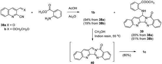 Very recently, Wagh et al. reported a concise and convergent synthesis of luotonin B in 54% and 19%, respectively, along with 39, by employing a cascade cyclization of 2-cyanoquinoline-3-aldehyde (38a) or 3-(1,3-dioxolan-2-yl)quinoline-2-carbonitrile (38b) with methyl anthranilate in a mixture of acetic acid and acetic anhydride [50] (Scheme 20). Dehydration of luotonin B by Indion resin or Amberlist 25 acidic resin resulted in imminium ion 40 which was then underwent methylation to give luotonin E in 80% yield.