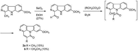 Although numerous synthetic procedures for the parent canthin-6-one core have been reported [51,52,53,54], only one synthetic procedure for luotonin C and D has been published [4]. Luotonin C and D were first prepared in two steps by a biomimetic way from harmine coexisting with these alkaloids in the same plant source. Selenium oxidation of harmine afforded the corresponding aldehyde in 27% yield which was acylated with propionic anhydride and n-butyric anhydride in the presence of triethylamine to yield luotonin C and D in 15% and 13% yields, respectively (Scheme 21).