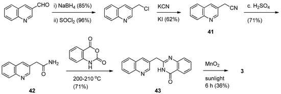 A synthetic sequence of Nomura and his coworkers for luotonin F started from 3-formylquinoline [5]. 3-Hydroxymethylquinoline prepared by a reduction of 3-formylquinoline with NaBH4 was converted to the corresponding 3-chloromethylquinoline which was then subjected to nucleophilic substitution by KCN to provide the nitrile compound 41. Partial hydrolysis by conc. sulfuric acid provided an amide 42 which was condensed with isatoic anhydride to yield 2-(quinolin-3-ylmethyl)-quinazolin-4(3H)-one (deoxyluotonin F, 43). The synthetic sequence was completed by oxidation of 43 with activated MnO2 in the presence of sunlight to afford luotonin F in 36% yield (Scheme 22).