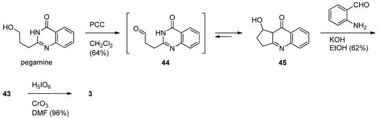 Mhaske and Argade described a biogenetic synthesis of luotonin F starting from pegamine [55]. PCC oxidation of pegamine afforded isovasicinone (45) via the corresponding aldehyde 44which was subjected to Friedländer condensation with 2-aminobenzaldehyde in the presence of ethanolic KOH to give deoxyluotonin F in 62% yield via in situ ring opening of 45. Chromium trioxide catalyzed periodic acid oxidation of deoxyluotonin F afforded the desired luotonin F in 96% yield (Scheme 23).