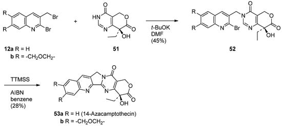 Hecht and his coworkers designed 14-aza-camptothecin (53a) [61] and its methylenedioxy derivative (53b) [45] as a hybrid of camptothecin and luotonin A and prepared them in two-steps (N-alklyation followed by a radical-mediated cyclization) from 2-bromo-3-(bromomethyl)quinoline (12a) and its 6,7-methylenedioxy derivative (12b) and pyranopyrimidindione (51) (Scheme 25).