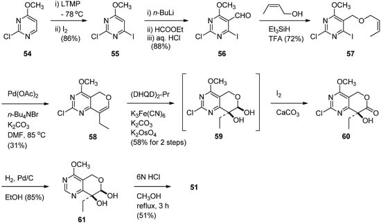 The prerequisite 51 was prepared in nine steps from commercially available 2-chloro-6-methoxy-pyrimidine [60] (Scheme 26). Iodination of 54 gave 4-iodopyrimidine 55 which was lithiated with n-BuLi and subsequently treated with ethyl formate to give the corresponding aldehyde 56 in 88% yield. Reductive etherification with crotonyl alcohol in the presence of Et3SiH and TFA afforded crotyl ether 57 which was subjected to the Heck coupling to yield an alkene 58. Asymmetric dihydroxylation of 58 in the presence of the chiral ligand (DHQD)2-PYR (AD-system) afforded the corresponding lactol 59 which was not isolated, but instead treated with I2-mediated oxidation to give a lactone 60. The lactone was dechlorinated to provide 61 by hydrogenolysis over 10% Pd/C and subsequent hydrolysis with 6N HCl to afford the desired 51 in 4.9% overall yield.