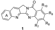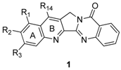 - Narco, K.; Zha, C.C.; Guzzo, P.R.; Herr, R.J.; Peace, D.; Friedrich, T.D. Synthesis and Topoisomerase Poisoning Activity of A-Ring and E-Ring Substituted Luotonin A Derivatives. Bioorg. Med. Chem. 2007, 15, 4237–4246. [Google Scholar]