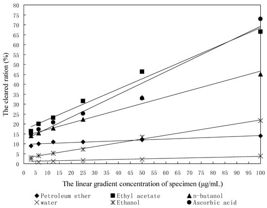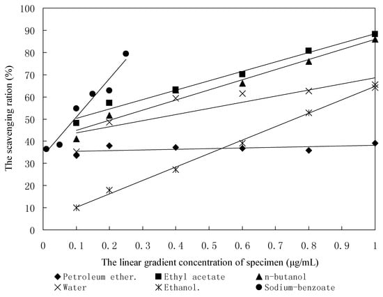 Among the oxygen radicals, hydroxyl radical is the most active and induces severe damage to adjacent biomolecules [17]. In this study, the Fenton reagent (Fe2+ + H2O2 Fe3+ +OH− + −OH) as a source of hydroxyl radical was used to test the scavenging activity of the five studied samples towards hydroxyl radical. As shown in Figure 2 and Table 3, all five studied samples except for the petroleum ether fraction exhibited potent or moderate activity in an concentration dependent manner. The linear regression equations of the hydroxyl radical-scavenging activities on the concentrations of sodium benzoate and the five studied samples except the petroleum ether fraction were significant at the significance level of 0.05. It indicated the five studied samples except for the petroleum ether fraction had hydroxyl radical-scavenging activity. According to the EC50 in Table 3, the hydroxyl radical-scavenging activity of the ethyl acetate fraction was slightly stronger than that of sodium benzoate. The EC50 values of hydroxyl radical-scavenging activity of the n-butanol fraction, water fraction, ethanol fraction and sodium benzoate were found to be 0.21 μg/mL, 0.33 μg/mL, 0.76 μg/mL and 0.09 μg/mL, respectively.