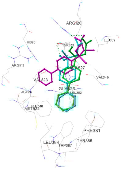 - Selinsky, B.S.; Gupta, K.; Sharkey, K.; Loll, P.J. Structural Analysis of NSAID Binding by Prostaglandin H2 Synthase: Time Dependent and Time-Independent Inhibitors Elicit Identical Enzyme Conformations. Biochemistry-US 2001, 40, 5172–5180. [Google Scholar] [CrossRef]