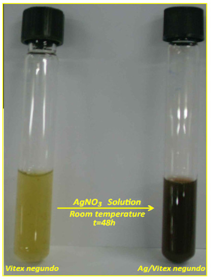 Briefly, crude extract of Vitex negundo (0.5 g) was added to distilled de-ionized water (100 mL) with vigorous stirring for 1 h. A hundred milliliters of AgNO3 (1 × 10−1 M) was then added and mixed at room temperature (25 °C) for 48 h. Silver nanoparticles were gradually obtained during the incubation period.