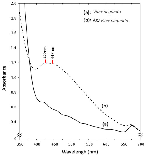 The formation of silver nanoparticles was followed by measuring the surface plasmon resonance (SPR) of the Vitex negundo and Ag/Vitex negundo emulsion at the wavelength range from 300–700 nm (Figure 2). The characteristic silver SPR bands were detected around 400–450 nm. These absorption bands were assumed to correspond to the silver nanoparticles extra fine and smaller than 25 nm. UV–Vis absorption spectra (Figure 2b) showed that the broad SPR band contained two peaks, one at 422 nm and the other at 447 nm. These two peaks illustrate the presence of two broad distribution of hydrosol silver nanoparticles.