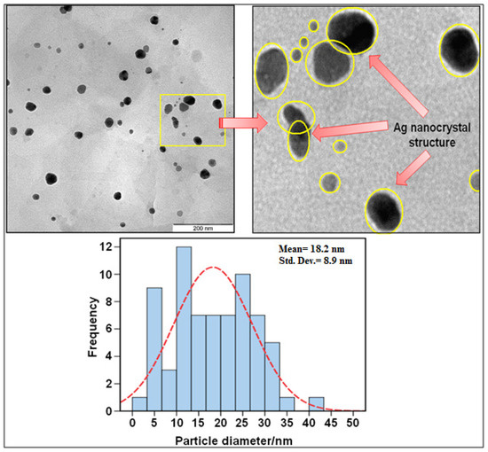 TEM image and corresponding size distribution of Ag/Vitex negundo after 48 h.