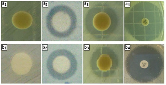 Antibacterial activity assay against E. coli (a1–a4) and S. aureus (b1–b4): (a1, b1) Vitex negundo extract (0.5 mg/mL), (a2, b2) AgNO3 (0.17 mol/L), (a3, b3) Ag/Vitex negundo, (a4, b4) Cefotaxime (30 µg).
