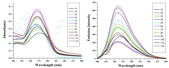 The fluorescent behavior of these compounds was studied by UV-Vis and emission spectroscopy, performed at room temperature (298 K). The UV-Vis and the emission spectra of 1,3,5-triaryl-2-pyrazolines 1h−12h, were recorded in N,N-dimethylformamide-water (3:7) solution at a concentration of 1 × 10−5 mol L−1 and 1 × 10−7 mol L−1, respectively.