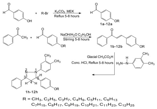 Twelve alkoxybenzaldehydes were synthesized by refluxing 4-hydroxybenzaldehyde with twelve alkyl bromides (CH3-Br – C12H25-Br) in the presence of potassium carbonate and butanone. The resulting 4-alkoxybenzaldehydes 1a-12a were reacted with acetophenone in the presence of sodium hydroxide and ethanol to yield corresponding 4-alkoxychalcones 1b-12b. 4-Alkoxychalcones were dissolved in glacial acetic acid containing a few drops of concentrated hydrochloric acid. This step was followed by the addition of (3,4-dimethylphenyl)hydrazaine hydrochloride. Finally the target compounds 1h-12h were precipitated by pouring the reaction mixture onto crushed ice as outlined in Scheme 1.