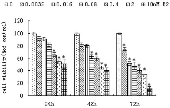 Effects of B2 on the growth of SMMC-7721 cells. SMMC-7721 cells were treated with B2 for 24, 48 and 72 h at the indicated concentrations, and cells viability was measured by an MTT assay. The data was expressed as means ± SD of three separate experiments. * p < 0.05, p value compared with the control group (0 nM).