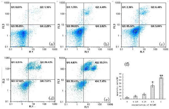 Apoptotic population of SMMC-7721 cells analysis by flow cytometric using annexin V-FITC/PI staining. Q1, necrotic cells (annexin V−/PI+); Q2, late apoptotic cells (annexin V+/PI+); Q3, viable cells (annexin V−/PI−); Q4, early apoptotic cells (annexin V+/PI−). (a) 0 nM; (b) 0.125 nM; (c) 0.25 nM; (d) 0.5 nM; (e) 1 nM B2 for 48 h; (f), the percentage of annexin V positive population on every concentration of B2. ** p < 0.01, * p < 0.05, p value compared with the control group (0 nM).