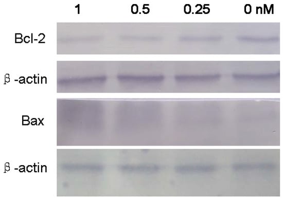 After the drug treatment, SMMC-7721 cells were collected and washed with cold PBS, then treated with ice-cold lysis buffer with 1% PMSF (phenylmethylsulfonyl fluoride). Cell lysates were centrifuged at 12,000 × g at 4 °C for 5 min, then the supernatants were collected, and the protein concentration was determined by the BCA Protein Assay Kit. Equal amounts of protein lysates were subjected to electrophoresis on 12% SDS-PAGE and transferred onto PVDF membranes. Non-specific binding was reduced by incubating in blocking buffer for 2 h at room temperature. After blocking, the membrane was incubated with specific primary antibodies (anti-Bcl-2 and anti-Bax antibodies) overnight at 4 °C and further incubated for 1 h with alkaline phosphatase labeled respective secondary antibodies. The membrane was incubated with BCIP/NBT solution until color development was achieved. The reaction was stopped by the addition of distilled water.