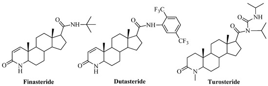 Various steroidal [10,11,12] and non-steroidal [13,14,15] inhibitors have been synthesized and tested against 5AR. Of these, finasteride (PROSCAR®, Figure 1), a type II-selective 5α-reductase inhibitor, was the first 5AR inhibitor approved in the USA for the treatment of BPH and prostate cancer. It has also been demonstrated that dutasteride (Figure 1) acts as a 5AR1 and 5AR2 inhibitor [16] and turosteride (Figure 1) is selective for the type II isoform of 5α-reductase. However, since finasteride is slow acting and produces side effects affecting sexual function [17], this has caused us and others to seek new classes of steroidal and non-steroidal inhibitors.
