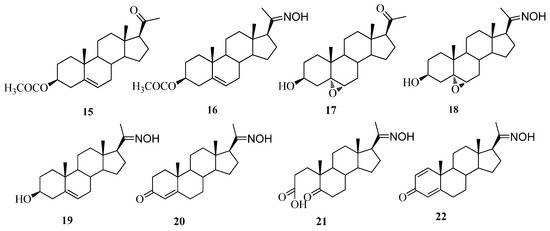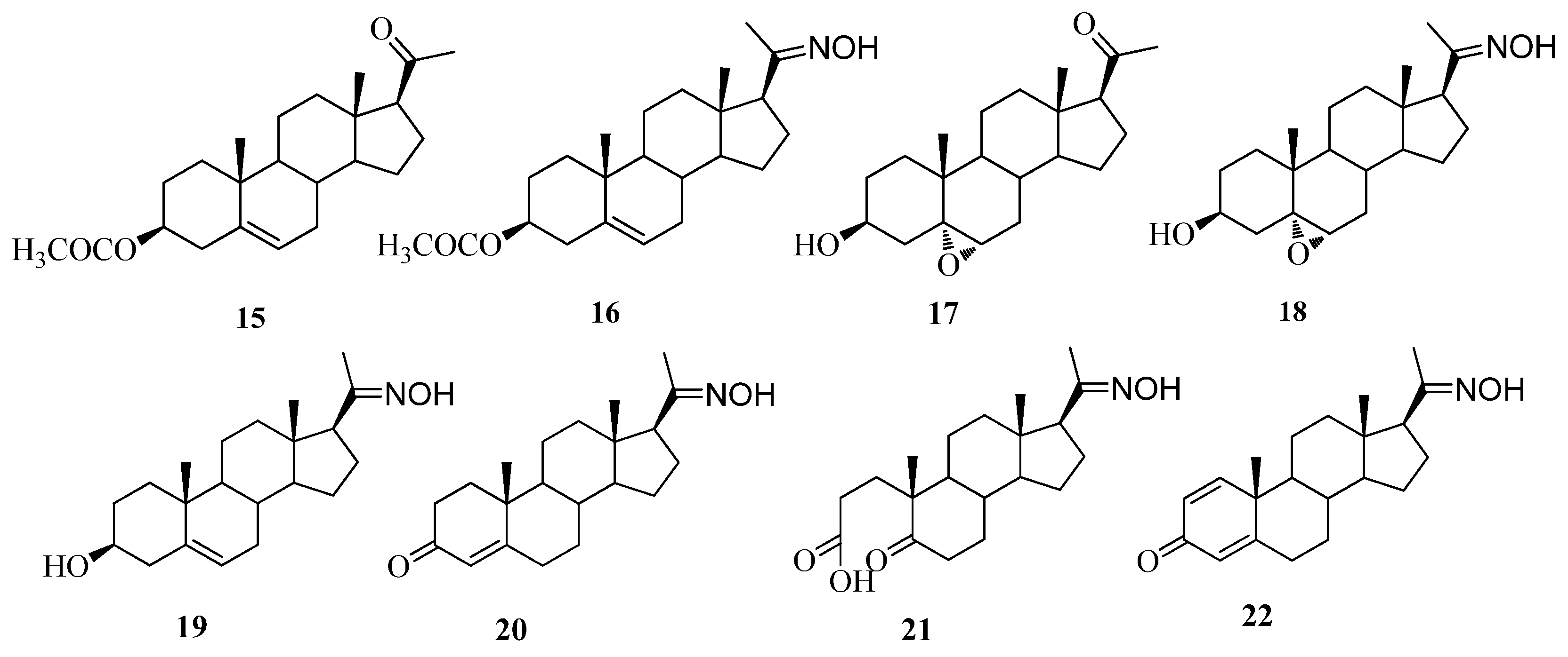 The reaction of 10 and hydroxylamine under reflux conditions for 6 h gave 20-oxime 11 and 3,20-dioxime 12. The two oxime hydrogen peaks (H-3 and H-20) of compound 12 were identified at 11.34 and 10.39 ppm in its 1H-NMR spectrum and the two carbon peaks (C-3 and C-20) were identified at 147.3 and 149.5 ppm in the 13C-NMR spectrum. The structure of 11 was identified by observing one carbonyl carbon peak (C-3) at 183.2 ppm in the 13C-NMR spectrum and one oxime hydrogen peak at 10.28 ppm in the 1H-NMR spectrum. The configuration of 20-oxime 12 was identified as E- by observing no correlation peak of the H-16 and the proton 20-oxime group in the COSY spectrum. The 3-oxime 12 showed no correlation peak of the H-4 or H-2 and the proton 3-oxime group in the COSY spectrum. To support the configuration of the 3-oxime, it should be noted that the suggestions about anisotropic influence of N-O bond in E- an Z-isomeric 3-steroidal oxime on chemical shifts differences of 4-H signal were experimentally confirmed in this study [27,28]. The chemical shift of H-4 peak (6.15 ppm) of 12 was shifted further downfield than H-4 peak (5.87 ppm) of 11, thus confirming the E-configuration of the 3-oxime group. Compound 13 was reacted with hydroxylamine under reflux conditions for 6 h to yield 6α,7α-epoxypregna-1,4-diene-3,20-dione-20-oxime (14). One carbonyl carbon peak (C-3) of 14 at 185.4 ppm was observed in the corresponding 13C-NMR spectrum. The structures of compounds 15–22 are shown in Figure 2.