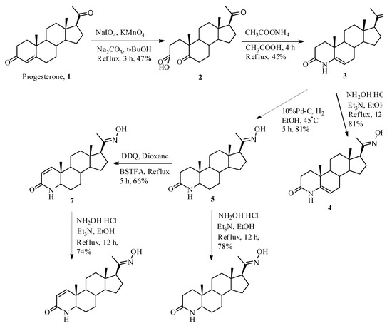 The syntheses of 4-azapregnene or 4-azapregnane 20-oxime and pregnane or 5-pregnene 20-oxime derivatives are shown in Scheme 1 and Scheme 2. Progesterone (1) was treated with sodium periodate and potassium permanganate to form 5,20-dioxo-A-nor-3,5-secopregnane-3-oic acid (2) [25]. This compound was treated with ammonium formate to afford 4-aza-5-pregnene-3,20-dione (3) in 45% yield, which was converted into its 20-oxime analog 4 in 71% yield using hydroxylamine. The 20-C=O carbon peak (209.4 ppm) of compound 3 was not observed in 13C-NMR spectrum of compound 4, but the 20-C=NOH carbon peak was identified at 158.9 ppm. In the IR spectrum of 4, the characteristic oxime bands were observed at 3,575 cm−1 (OH), 1,668 cm−1 (C=N) and 953 cm−1 (N-O), and N-H and 3-C=O bands of A ring of 4-azasteroid skeleton were observed at 3,200 and 1,660 cm−1, respectively.