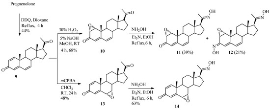 Compound 11: Yield: 41 mg (39%), m.p.: 228–230 °C; 1H-NMR (DMSO-d6) δ: 10.28 (1H, s, 20-NOH), 6.10 (1H, d, J = 9.2 Hz, H-7), 6.01 (1H, d, J = 9.2 Hz, H-6), 5.87 (1H, s, H-4), 3.60 (1H, s, H-2), 3.41 (1H, s, H-1), 1.71 (3H, s, 21-CH3), 1.05 (3H, s, 19-CH3), 0.68 (3H, s, 18-CH3); 13C-NMR (CDCl3) δ: 189.4 (C-3), 156.2 (C-5), 148.5 (C-20), 134.7 (C-7), 128.1 (C-6), 117.3 (C-4), 58.0 (C-1), 55.9 (C-2), 53.1, 52.9, 45.3, 43.3, 37.5, 37.4, 36.4, 22.8, 22.0, 21.5, 18.2, 15.8, 13.6; GC-MS (EI) m/z: 341 [M]+; IR, cm−1: 3569 (OH), 1673 (C=N), 1661 (3-C=O), 950 (N-O).