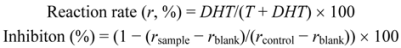 where DHT and T are the 3H radioactivity recovered in the areas of 5α-dihydrotestosterone and testosterone, respectively. rsample and rcontrol are reaction rates of the test sample and the enzyme control in which reaction rates are measured in the presence and absence of test sample, respectively, and rblank is reaction rate of the substrate blank in which reaction rate is measured in the absence of test sample and enzyme suspension. IC50 was calculated from the inhibitory activity values at several concentrations using linear regression analysis. Each enzyme reaction was carried out in duplicate.
