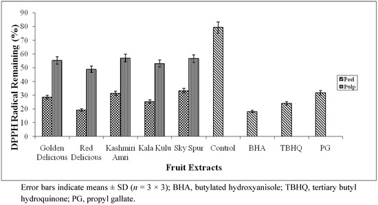 The peel and pulp of fruits of the studied cultivars of apple yielded promising amounts of extractable matter (dry weight basis) with aqueous methanol. The mean extraction yield of antioxidant components was found to be 22.1 g/100 g for peel and 14.2 g/100 g for pulp. Relatively a higher extraction yield was obtained for peel than the pulp samples. The significant differences in the extraction yield between peel and pulp of same fruits might be ascribed to the varying availability of extractable components, resulting from the varied chemical composition of the different tissues used. Li et al. [22] also reported that percent yield of pomegranate peel (31.5%) extract was higher compared to that of pulp (14.5%) extract.