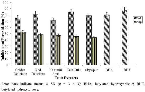 A significant difference in percent inhibition of peroxidation was observed between peel and pulp parts of the five cultivars of apple fruit. However, variation of these data among different cultivars was found to be non-significant. Considerable inhibition of linoleic acid peroxidation by peel and pulp extracts tested might be attributed to the presence of phenolics, anthocyanins, epicatechin and flavone-3-ol in these fruits [25].