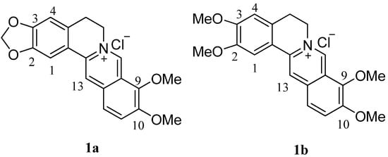 In addition, palmatine (1b, Figure 1) is a close structural analog of berberine. The alkaloid has been used in the treatment of jaundice, dysentery, hypertension, inflammation, and liver-related diseases [27]. It has been reported that like berberine, some of the 8- and 13-alkyl analogues of palmatine also possess antimicrobial and antimalarial activities [28]. Palmatine also has significant antitumor activity against HL-60 leukemic cells [29].