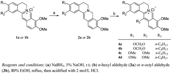 The synthesis of the 13-n-alkyl substituted berberine and palmatine analogues involved two steps (Scheme 1). Treatment of commercially available berberine (1a) or palmatine (1b) with NaBH4in 5% NaOH at room temperature gave the key reduced intermediates 2a,b, the dihydrogenated products of 1a and 1b [30]. Then, compounds 2a,b were reacted with n-hexyl aldehyde (3a) and n-octyl aldehyde (3b), respectively, in a EtOH and HOAc solvent mixture, and then acidified with 2 mol/L HCl to yield the desired compounds 4a–d, which were fully characterized by 1H-NMR, LR-MS and elemental analysis.