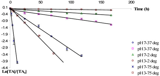 Almost the same Q10 values were obtained for the degradation of anthocyanins in water at pH = 7, proving that the influence of the increase of the temperature on the stability of the anthocyanins is the same for both studied temperature intervals (2–37 °C and 37–75 °C). The lowest temperature coefficient value (1.018 K−1 at 2–37 °C) was obtained in water at pH = 3 indicating that low storage temperatures and acidic media are needed to inhibit degradation of anthocyanins from European cranberrybush fruits extracts.