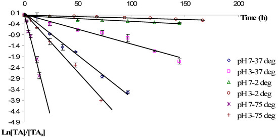 The dependence of degradation rate on temperature was also evaluated by calculating the temperature coefficient Q10, according to Equation (4):