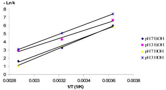 To determine the effect of temperature on the kinetics of the degradation process, the constants obtained from Equations (1) and (2) were fitted to an Arrhenius type equation (Equation (3)):