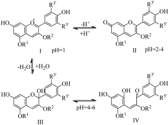 Anthocyanins are a group of naturally occurring phenolic compounds, which play an important role in the color quality of many flowers, fruits, vegetables and related products derived from them. Recently, anthocyanins were reported to have important biological activity, presenting antioxidant, antimutagenic, anticancer and antiobesity properties [8,9,10], as well as reducing the risk of coronary heart disease [11]. Besides their biological activities, the bright colour of anthocyanins (orange, red, purple, blue), ensures a high potential of being used as natural dyes as an alternative to artificial colorants. The colour of anthocyanins depends essentially on the chemical structure of different forms in which they can be found, these structures being strongly related to the pH value of the solution. For example, the flavilium cation I (red colour) is the predominant species at pH = 1, while at pH values between 2 and 4, the quinoidal blue base II predominates (Scheme 1).
