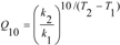 where Q10 = the temperature coefficient (K−1); k1,2 = rate constant (h−1) at temperature T1,2 (K).