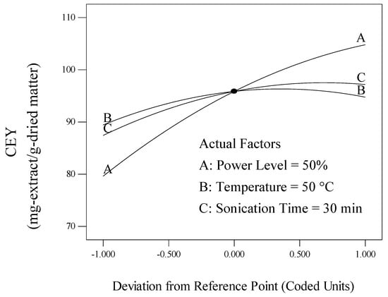 The individual effect of process variables, including power level (A), temperature (B) and sonication time (C), on the CEY was found by perturbation plot. A perturbation plot does not show the effect of interactions and it is like one factor-at-a-time experimentation. The perturbation plot helps to compare the effect of all process variables at a particular point in the design space. The response is plotted by changing only one factor over its range while holding of the other factors constant. A steep slope or curvature in a factor shows that the response is sensitive to that factor. A relatively flat line shows insensitivity to change in that particular factor. Therefore, it was revealed that CEY is more sensitive to power level than sonication time and temperature. The perturbation plot for the CEY is shown in Figure 1.