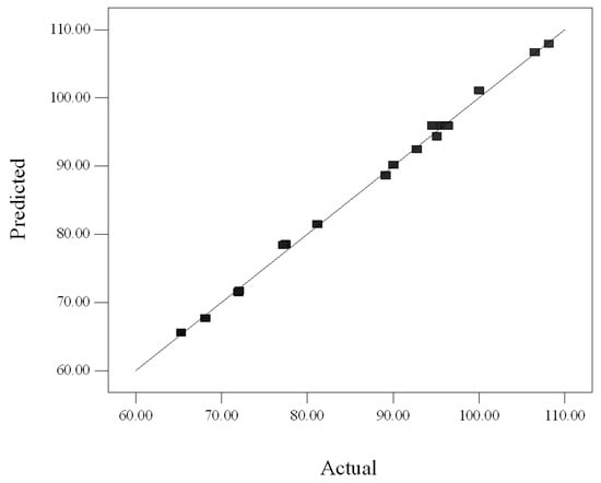 Figure 2 shows that the predicted values were very close to the actual values. Indeed, the high value of R2 (0.997) confirmed the true behavior of the system which defined by the regression model. In addition, the suitability of the rendered model was supported by the closeness of adjusted-R2 (0.995) to 1 presenting a high degree of correlation between the experimental and predicted values. The E value was also calculated and is presented in Table 2. The small E value (0.55%) suggested that the obtained model was acceptable.